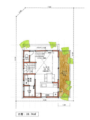土地は広いが建物は予算配分上の理由もあり、やや小ぶりである。 サーフィンをするので、大きめな玄関収納がほしい、ロフトと日当たりのよい2階のリビングがほしい、という御希望があった。 ウッドバルコニーでさらに広がりをつくっている。